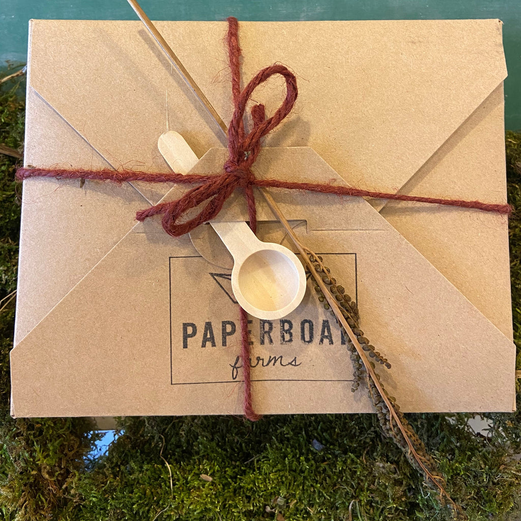 Need a gift for a loved one? Teacher? Co-worker? We have put together a gift box that included two of our best-selling products: garlic powder and scape salt! To top it off we have included two bulbs of fresh garlic bulbs and a little wooden spoon!