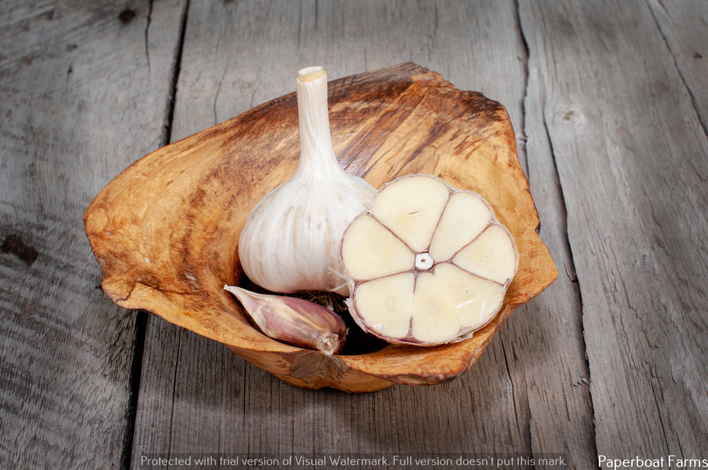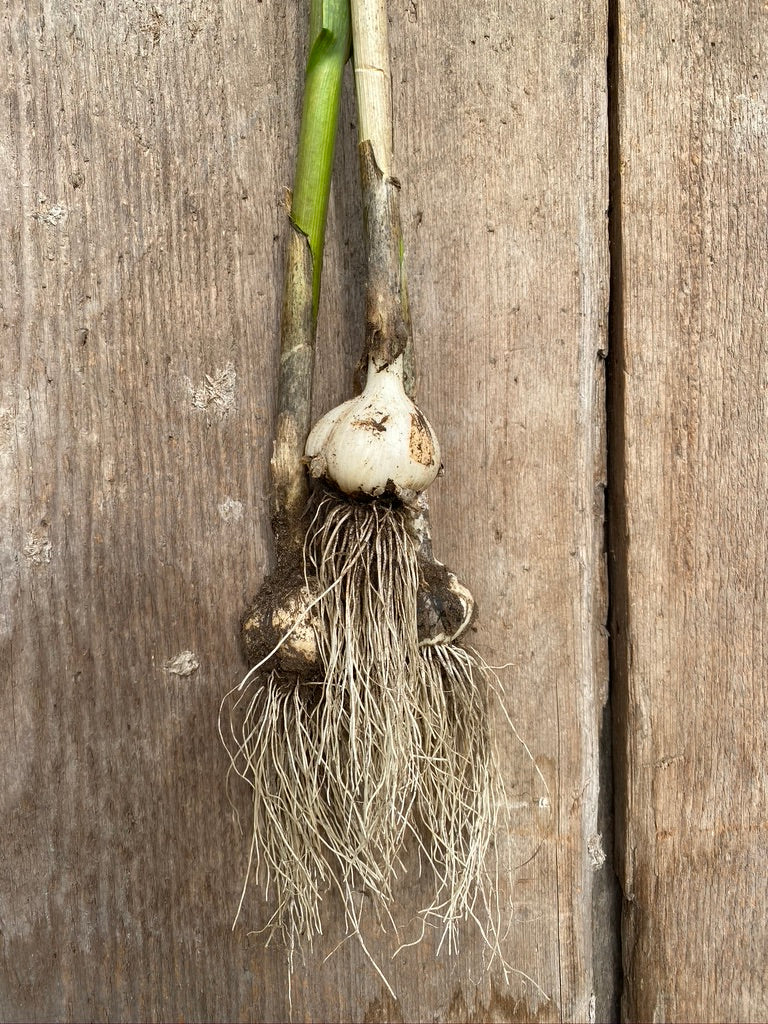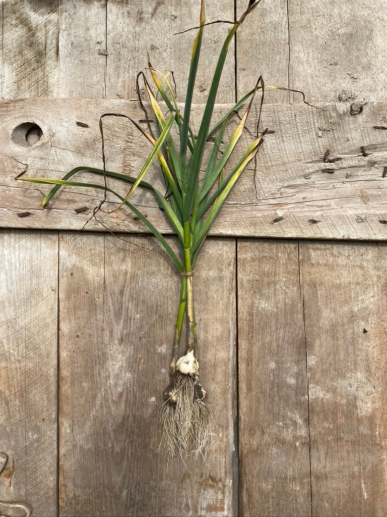 German Red is a hardneck garlic of the Rocambole variety. It averages 8-12 medium-sized cloves per bulb. German Red has thin light bulb wrappers with lots of light purple and brown in them and light brown skin around the cloves. It stores for 4-5 months.