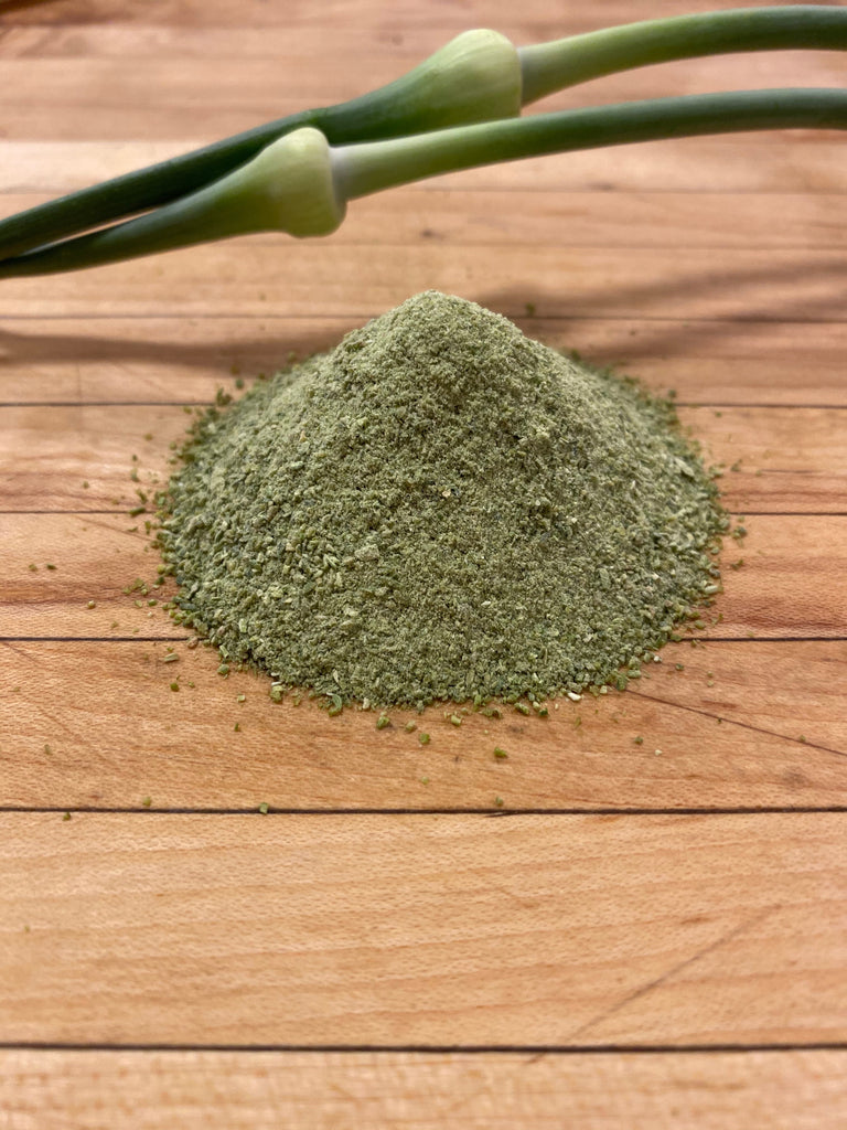 Scape powder can be used interchangeably to garlic powder. It has light garlic flavours with parsley, leek and chive like undertones. Scape powder can brighten any dish, and is well suited for homemade seasoning mixes or to add flavouring to meats, soups, dips, marinades and dressings or even mashed potatoes.